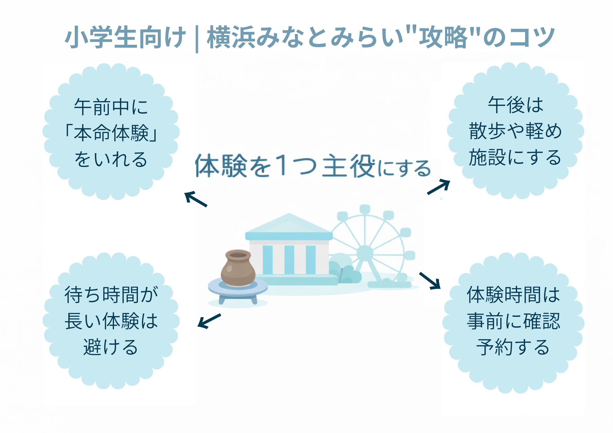 小学生中心なら、みなとみらいは「体験→休憩→気分転換」の流れが強いです。